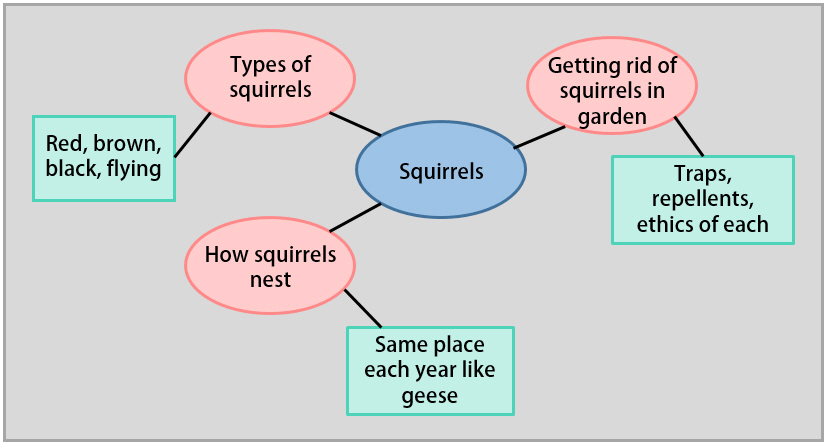 Mapping or diagramming helps you immediately group and see relationships among ideas. Mapping and diagramming may help you create information on a topic, and/or organize information from a list or freewriting entries, as a map provides a visual for the types of information you’ve generated about a topic. For example:
